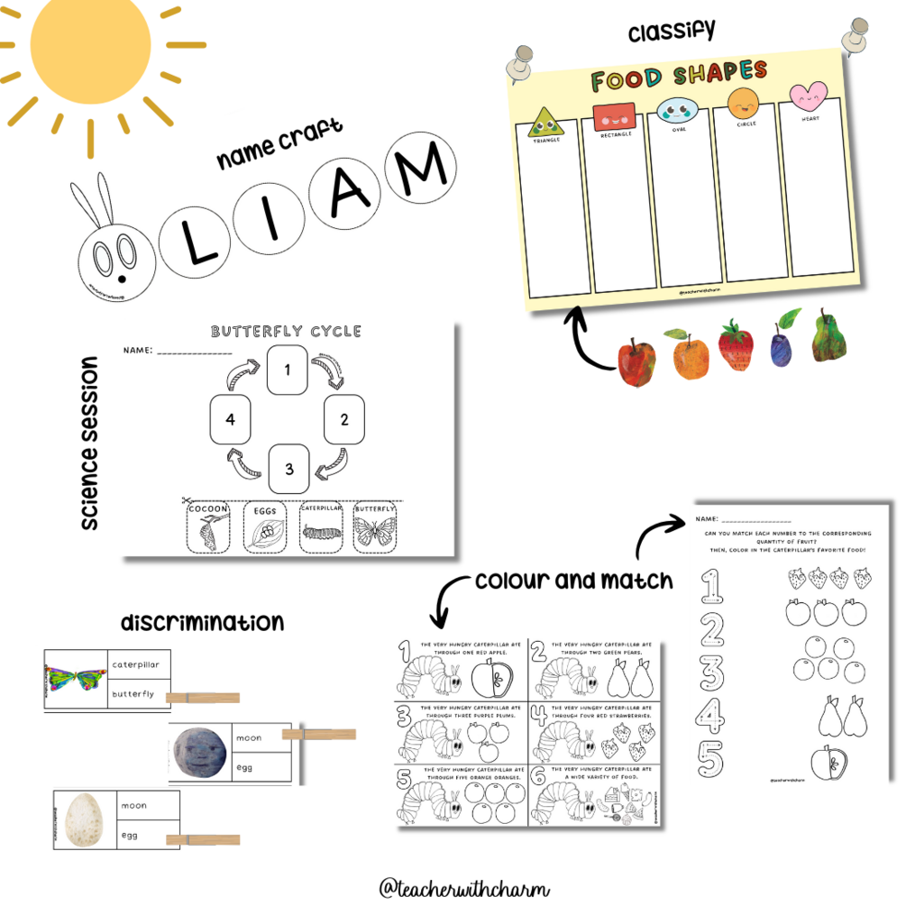 Este pack de recursos interactivos bilingües 🇬🇧🇪🇸 está diseñado para potenciar el aprendizaje a través del juego y la creatividad teniendo como referencia el libro de "The very hungry caterpillar" de Eric Carle ✨
