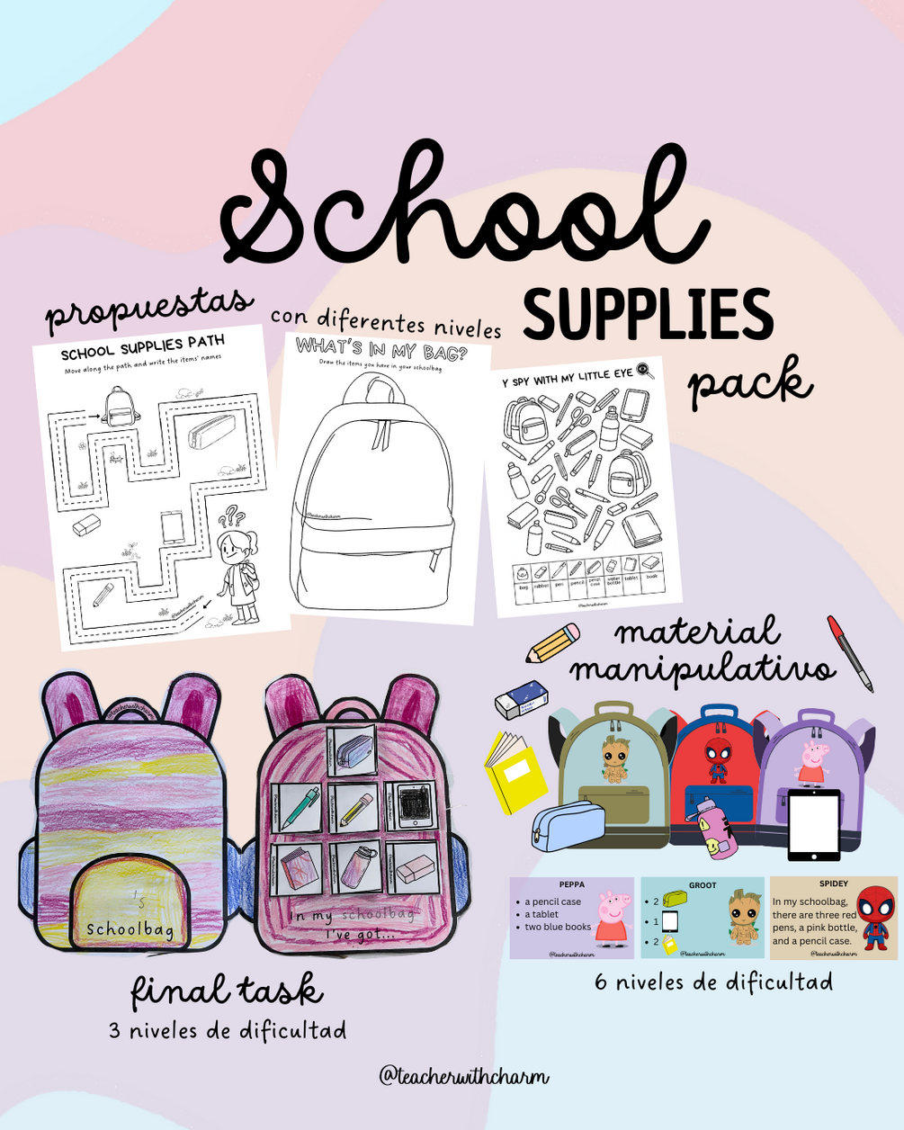 Os presento este PACK de SCHOOL SUPPLIES cargado de actividades creativas, manipulativas y listas para imprimir. Ideal para aprender vocabulario escolar de forma significativa, visual y divertida. 💼✨